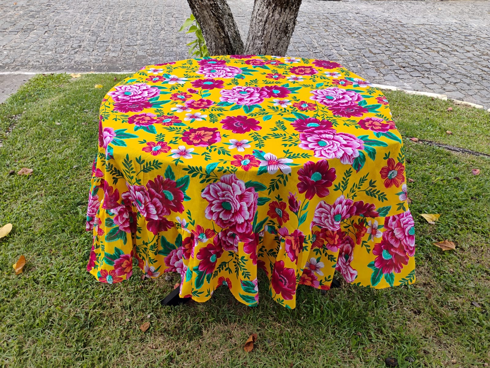 Confeccionada em tecido de chita/chitão floral com base reta de 1,40m de diâmetro e mais 20cm de babado, tornando a toalha com 1,80m de diâmetro e ótimo acabamento em bainha simples.